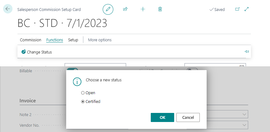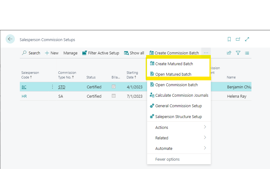 Attraverso i due bottono evidenziati nell’immagine (presa dalla pagina “Salesperson Commision Setup”), è possibile creare ed aprire il batch per le provvigioni maturate.
