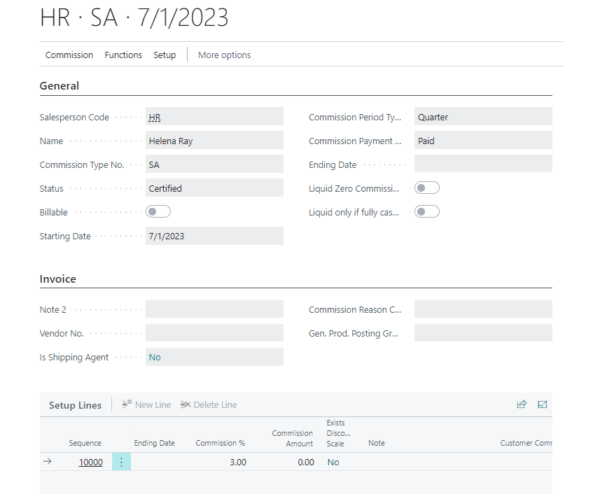 Per impostare il setup dell’agente è necessario solamente accedere alla Salesperson Commission Setup, nella quale è possibile scegliere l’agente, il tipo agente e le relative provvigioni.