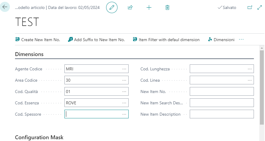 Successivamente, impostando “Configuration Mask” sarà possibile generare automaticamente (premendo il bottone “Create New Item No.”) il nome dell’articolo, la descrizione di ricerca e la descrizione dell’articolo.